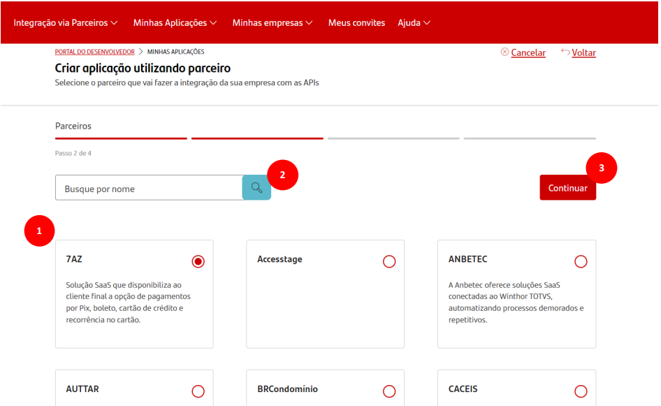 3. Minha empresas -> Lista de empresas -> “Criar aplicação” de uma empresa em específico -> Parceiro -> Começar.
