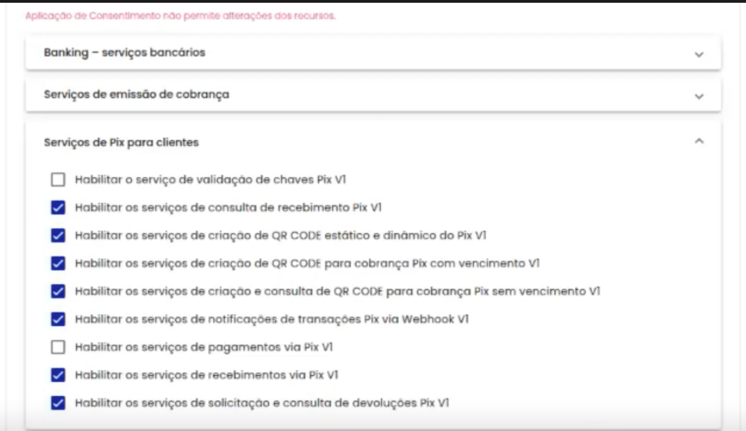 Dentro do painel ou site de gerenciamento da API, localize o campo ou seção onde será configurado o uso das APIs de Cashin, para assegurar que os serviços estejam devidamente integrados e funcionais.Ao finalizar a criação das chaves, serão liberados em tela, as Chaves de Acesso à API , o Scope e o Refresh_Token necessários para uso de cada tipo de API.
